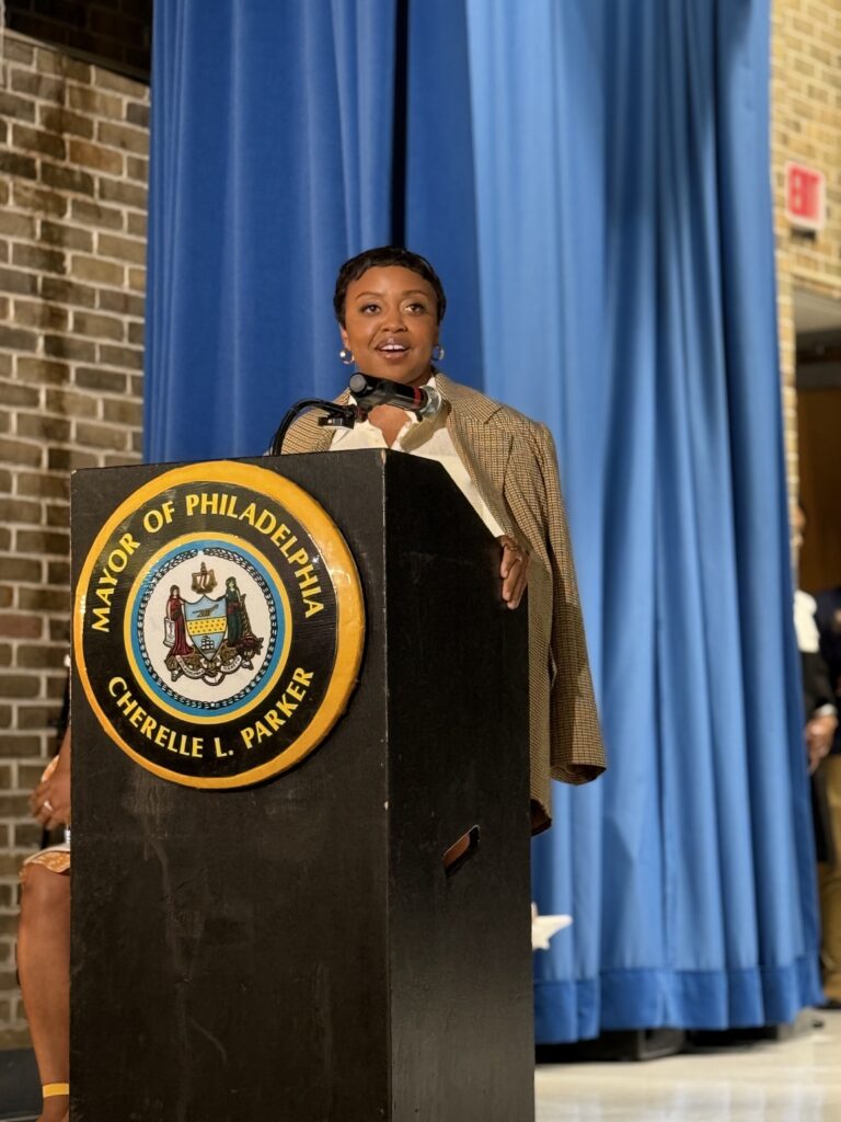 On stage with Brunson and Parker were a host of school and government officials, including Superintendent of Schools Tony Watlington Sr.; Hamilton Principal Torrence Rothmiller; student Glory Melton, who is featured in the mural; Jane Golden, executive director of Mural Arts Philadelphia; City Councilmember Jamie Gauthier, who represents the 3rd District; and Scott, who created the mural.