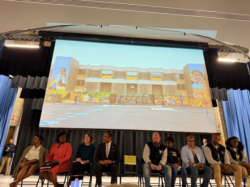 On stage with Brunson and Parker were a host of school and government officials, including Superintendent of Schools Tony Watlington Sr.; Hamilton Principal Torrence Rothmiller; student Glory Melton, who is featured in the mural; Jane Golden, executive director of Mural Arts Philadelphia; City Councilmember Jamie Gauthier, who represents the 3rd District; and Scott, who created the mural.